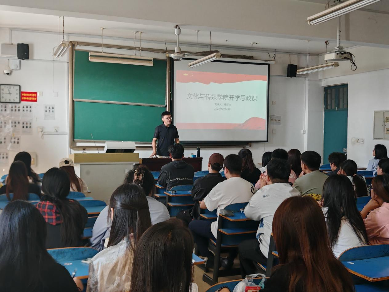 9 月 23 日上午9点,文化与传媒公司党总支书记杨延杰为2024级播音与主持艺术、广播电视编导同学讲授开学思政课。