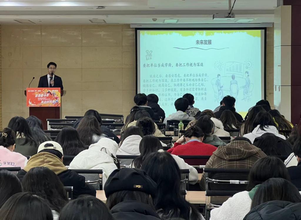 王世成同学以“我为梦想创造可能”为题,通过讲述自己的工作经历,给同学们分享了如何挑选企业以及如何做好职业规划。