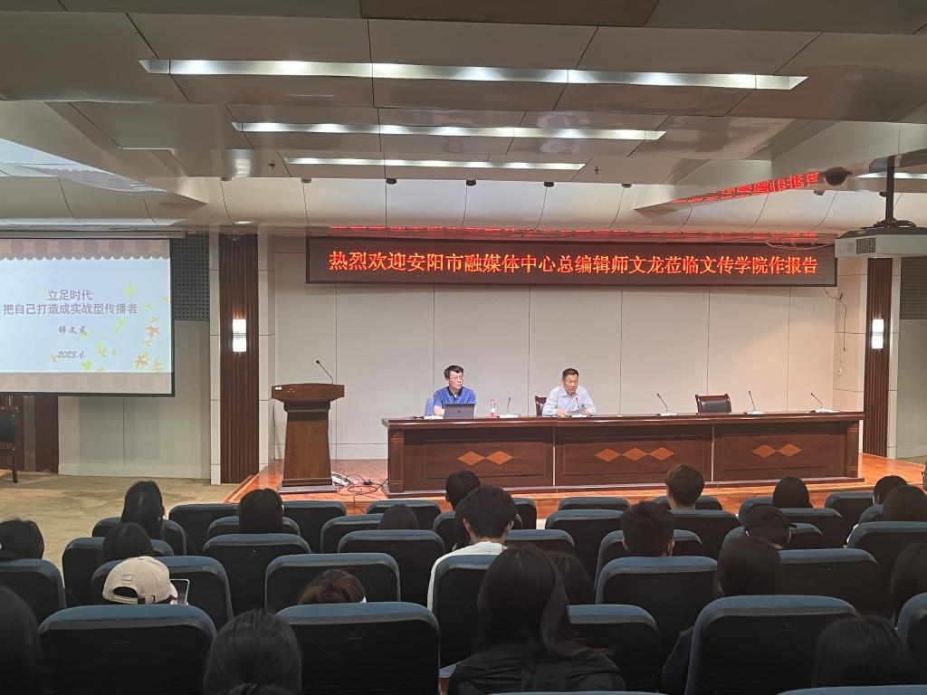 6月6日,安阳市融媒体中心总编辑师文龙在公司艺术设计公司二楼会议室做《立足时代,把自己打造成实战型传播者》学术报告。文传公司副经理余锐主持报告会,文传公司党总支书记张林以及文传公司300余名师生参加报告会。